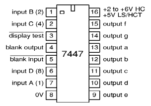- How to test the inputs LT (lamp test), ripple blanking input (RBI) and blanking input / ripple blanking output (BI/RBO) of TTL 7447 BCD-to-7-segment decoder