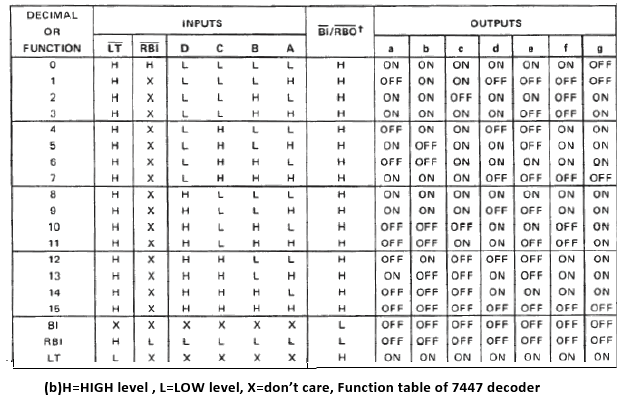 The operation of 7447 decoder/driver IC is given in complete detail by the function table shown in Figure 3(b). The decimal displays generated by the 7447 decoder are shown in Figure 3(c). figure.