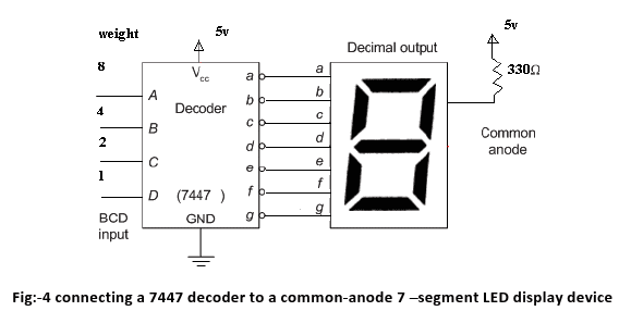 It may be noted that invalid BCD inputs (corresponding to the decimal numbers 10, 11, 12, 12, 14, and 15) can produce distinct outputs through the 7447 decoder. The 7447 decoder is typically connected to a common-anode 7-segment LED display device as shown in Figure 4. The presence of the current-limiting 330 Ω resistance between the power supply and the common anode terminal of the LED block avoids the need to connect seven resistors between the outputs a-g of the decoder and the corresponding cathode terminals of the LED block.figure.