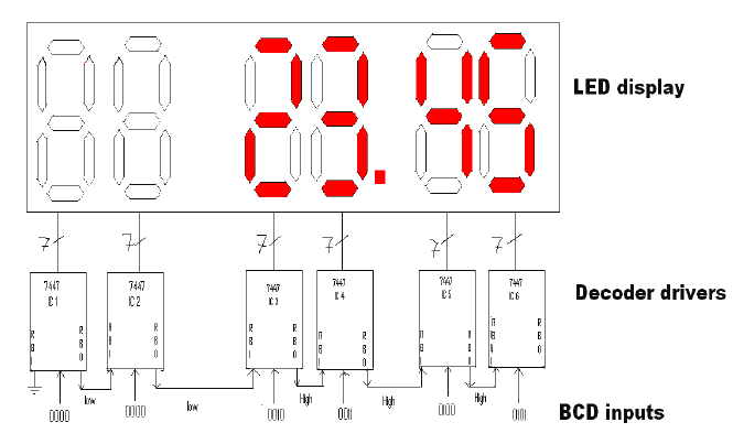 Applications like calculator require that the leading zeros be blanked out. Figure 5 shows the use of several 7447 decoder/drivers controlling a group of six LED displays as in a cash register. The present inputs to the six decoders are shown towards the bottom of Figure 5. The current BCD input is 0000 0000 0010 0011 0100 0101 (002345 in decimal). On blanking of the two left zeros, the display should read 23.45. Blanking of the leading 0s is taken care of by connecting the RBI and RBO terminals of pairs of 7447 decoder ICs as shown in Figure 5.Inspecting from left to right in Figure 5, note that RBI input terminal of IC1 is grounded. As its BCD input is 0000, the display is blanked out. Also, the RBO output of IC1, which is made to go low, is connected to the RBI input of IC2. As BCD input of IC2 is 0000, and RBI is low, its display is also banked out. This makes RBO of IC2 low, and this low level is passed to RBI of IC3. However, as BCD input of IC3 is 0010 (non-zero), display of IC3 is not blank. Thus RBO of IC3 is high, and this high level is passed to RBI of IC4. Note that once the displays to the right of IC2 are non-blank, even if some BCD input appears as 0000, the 0 will be displayed and not blanked out, for the RBI input will not be activated due to the nature of the connections between any two neighboring ICs figure.