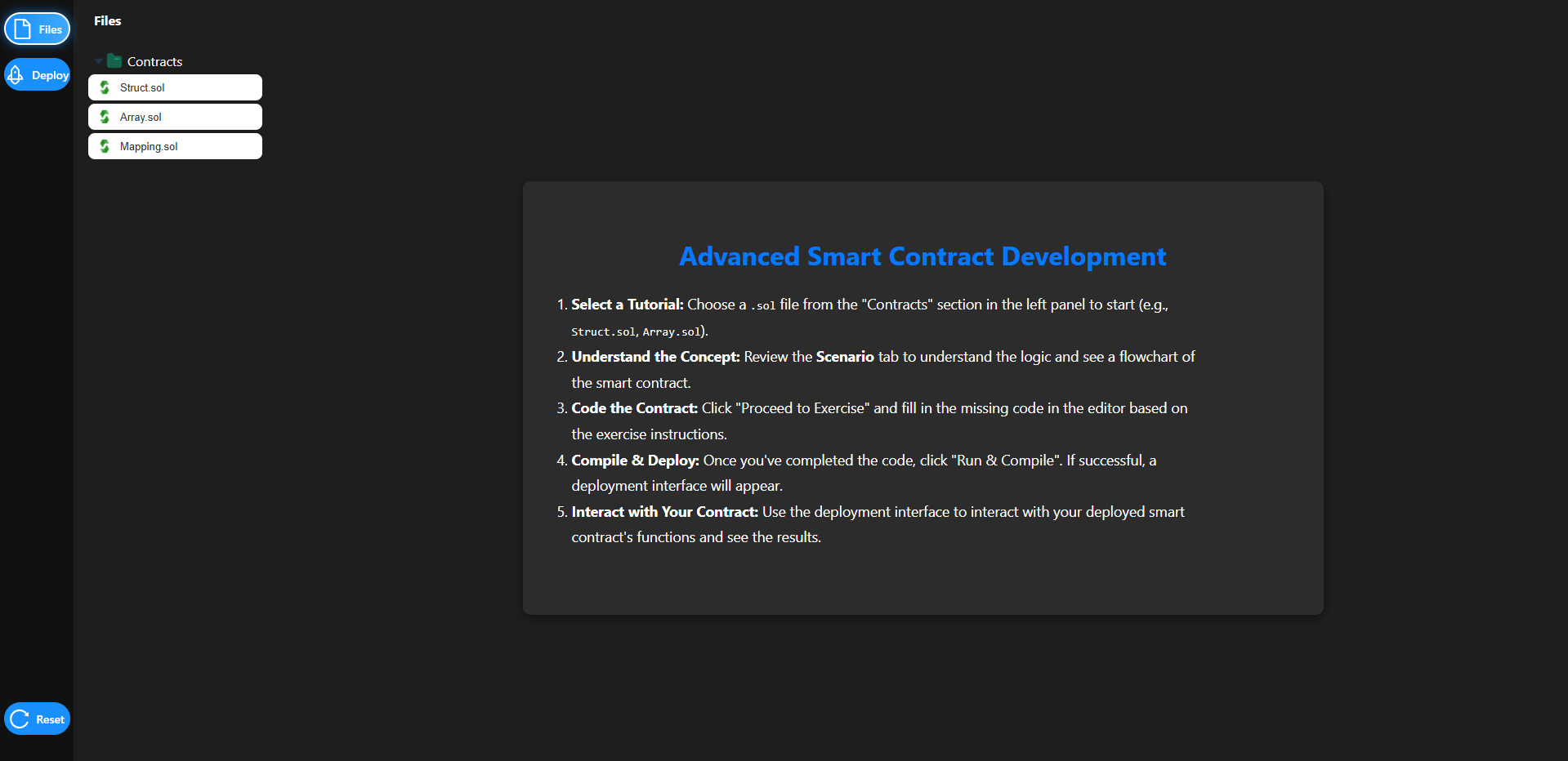 - Select Array.sol to practice working with dynamic and fixed-size arrays, including looping constructs such as for and while loops.