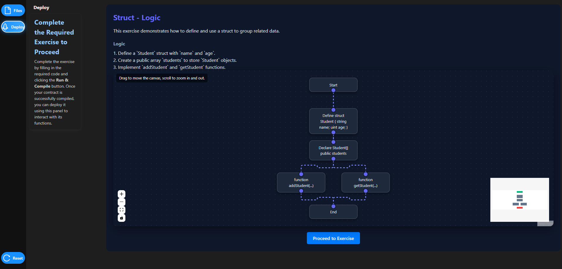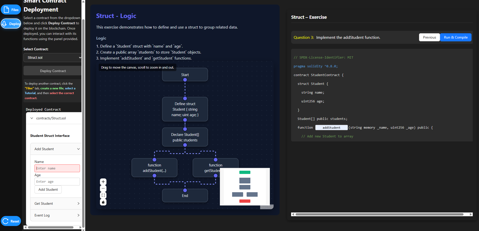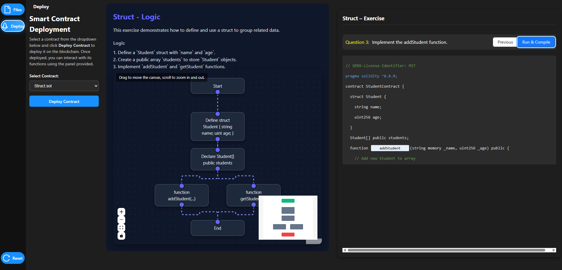 Struct.sol, the Struct – Logic page opens. - Observe the interactive flowchart that visually represents the conditional execution flow:
