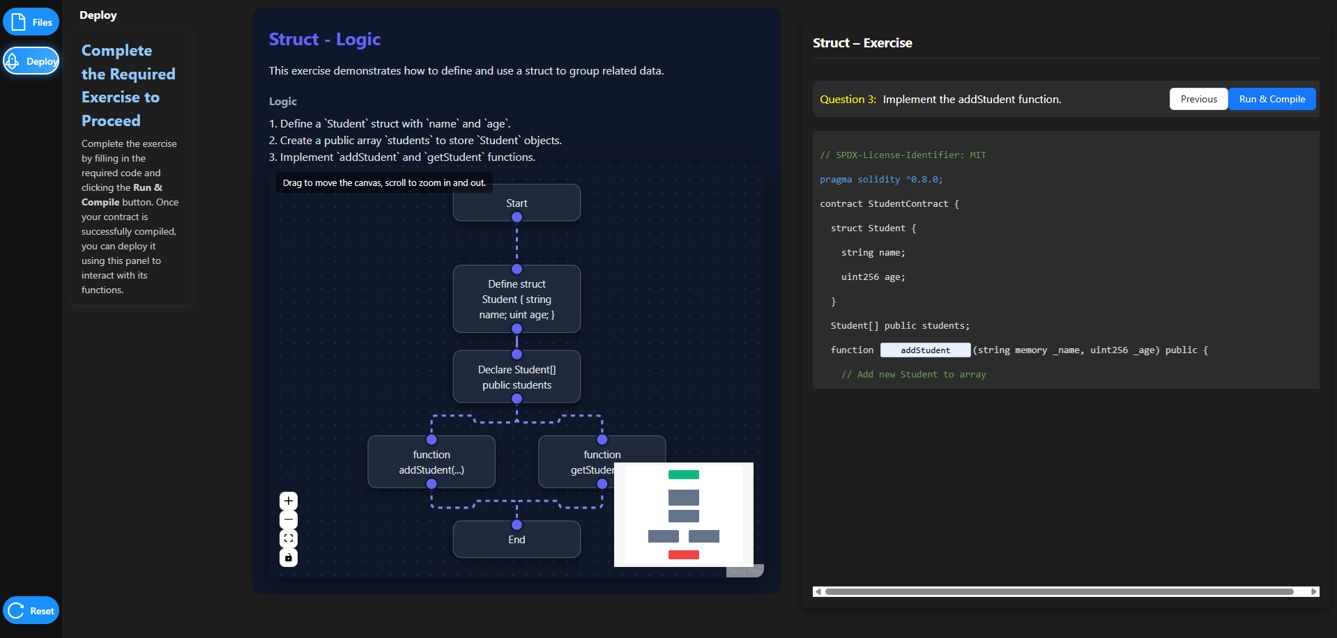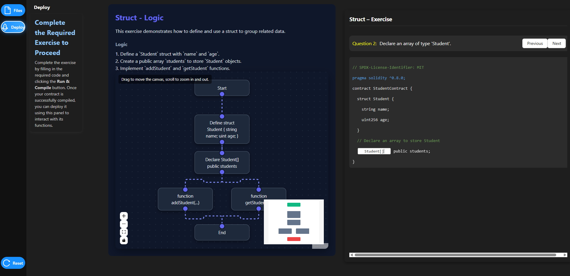 This simulation introduces advanced smart contract writing by demonstrating the implementation of structs, arrays, and mappings to organize and manage on-chain data. Learners will define structured data, store multiple records, and interact with deployed smart contracts.