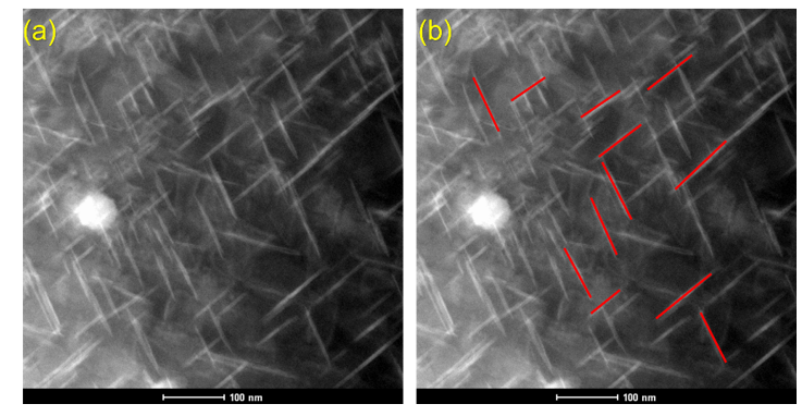 Figure 1: (a) Plate-like T1 precipitate in Al-Cu-Li alloy. (b) Precipitates which were used to calculate the diameter of plate-like precipitates.