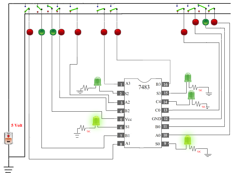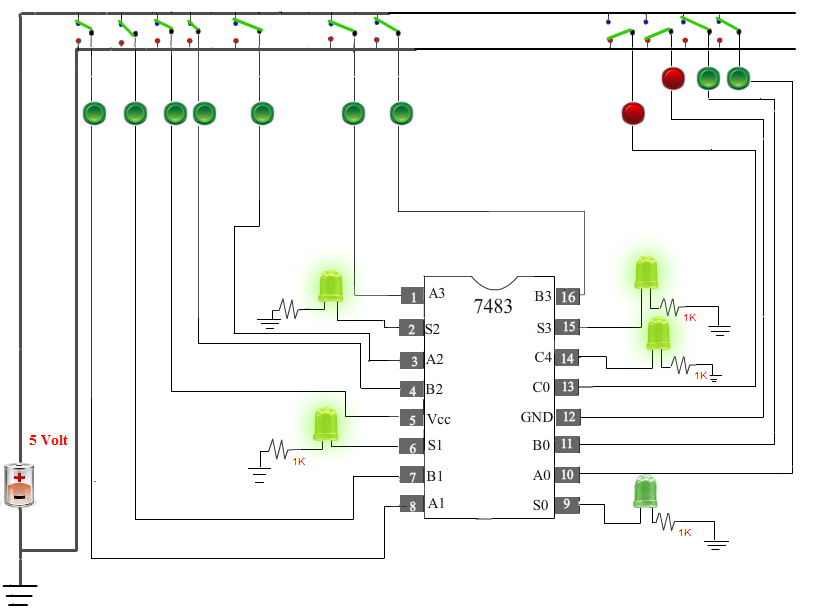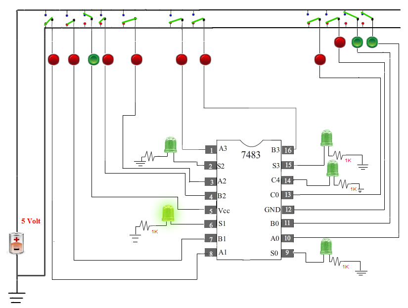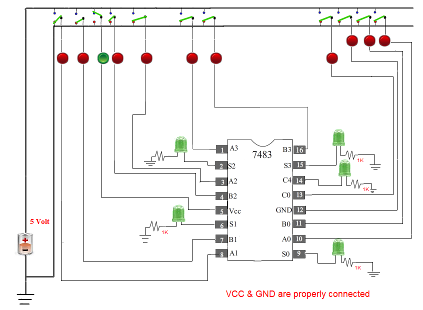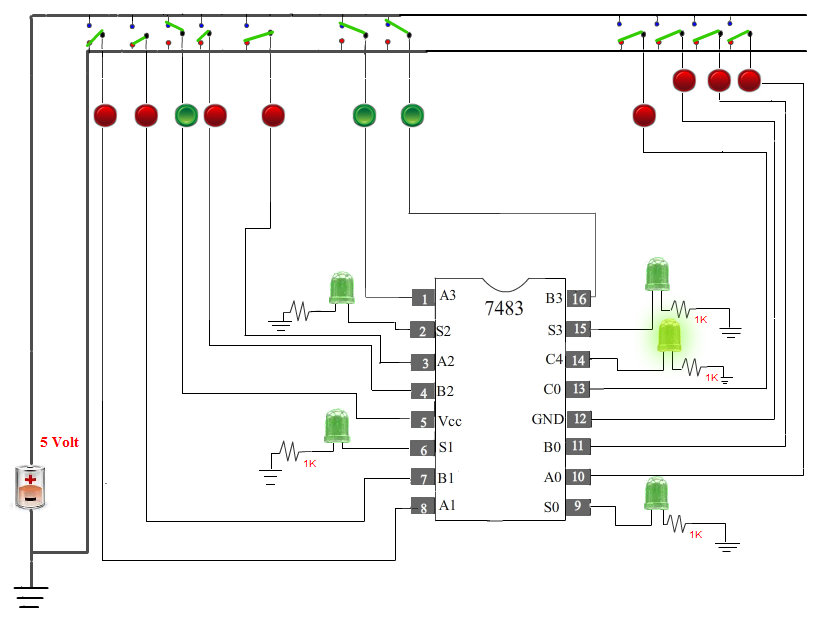 - Next, A0= 1, A1= 1, A2= 1, A3= 1 and B0= 1, B1= 1, B2= 1, B3= 1 now you can see the output result of S0= 0, S1= 1, S2= 1, S3= 1 and C4= 1.