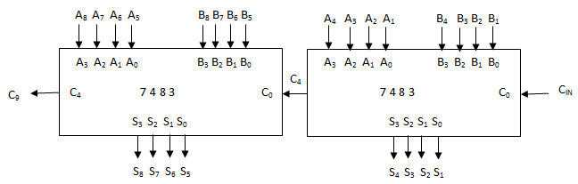 Cascading of two 7483 chips to achieve addition of two 8-bit numbers A = A8A7A6A5A4A3A2A1 and B = B8B7B6B5B4B3B2B1 to produce Sum = S8S7S6S5S4S3S2S1 and carry output C9 of the 217 input patterns possible , the students can test the 8bit adder for all zeros , all ones and some other input patterns.