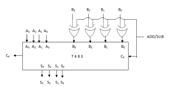 To implement a 4 bit adder/subtractor using 2's complement number system.Students learnt the use of 7486 (qued 2-input Ex-OR gates)in experiment 3.Using a 7483(parallel adder) and a 7486 chip one can realize 4 bit adder/subtractor.If ADD/SUB = "0" normal addition S = A + B performed.On the other hand if ADD/SUB = "1" then S = A + [B] + 1 where [B] = 1's complement of B. For example,if A = 0111(7) and B = 0101(5) then [B] = 1010 and S = 0010 or 2 neglecting carry out C4.If however A = 0101(5) and B = 0111(7) then B = 1000; or S = 1110 which represents -2 in 2's complement number system.