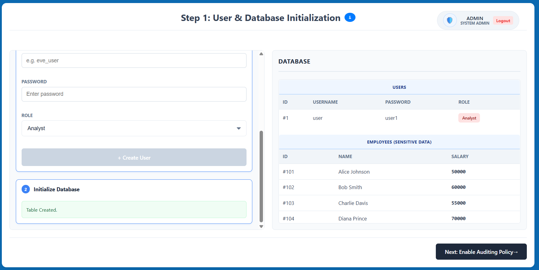EMPLOYEEStable) to use for testing. - Review the generated list in the database panel and click Next: Enable Auditing Policy.