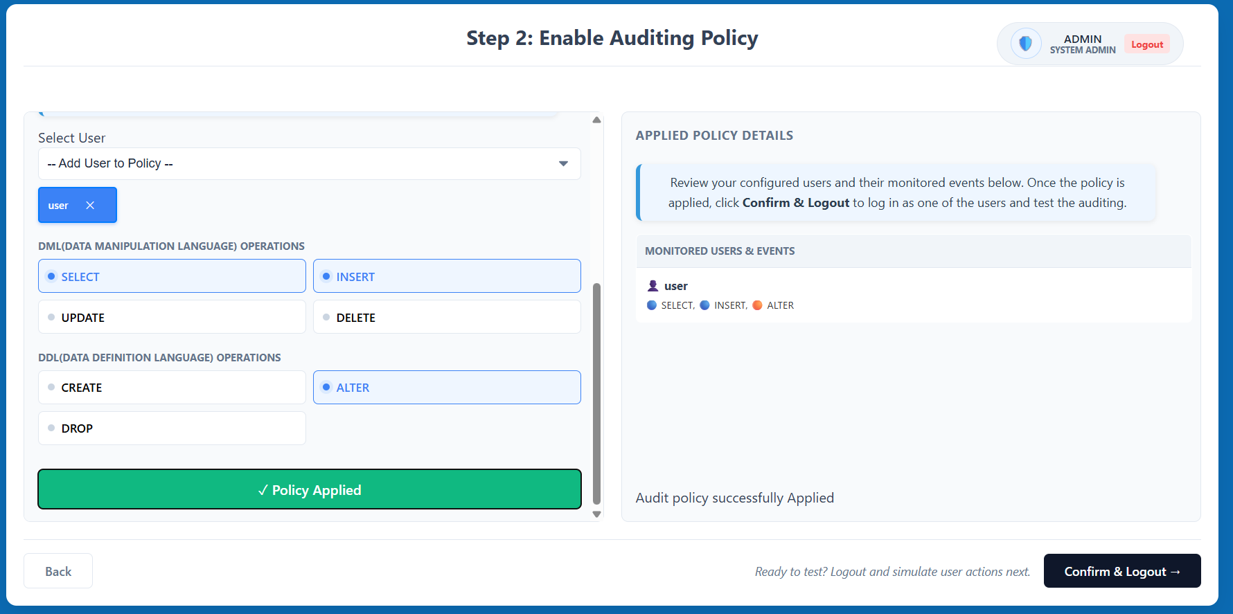 - Click Enable Auditing to apply the policy, then click Confirm & Logout to transition to the user simulation.