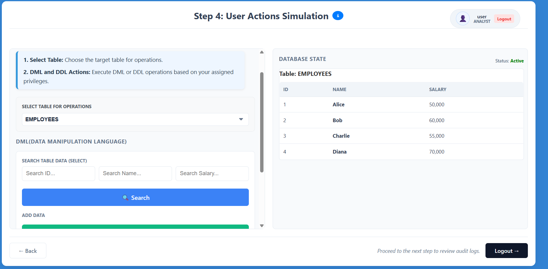 - Interact with the database interface as the selected user.