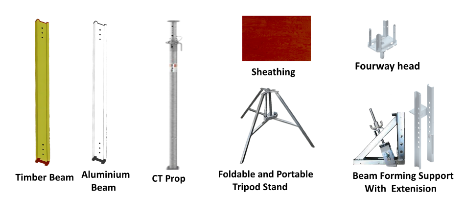 Apparatus Materials:Tripod Stand, CT prop, fourway head, Aluminium Beam, Timber Beam, Plywood Sheathing, Beam Forming support.