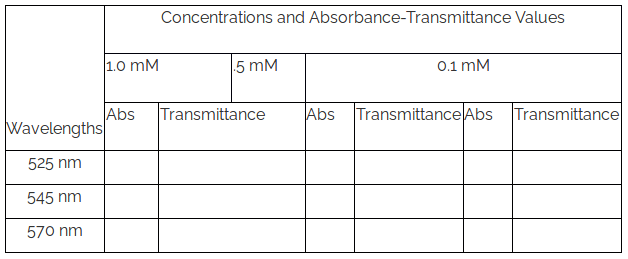 - Verify the Beer Law observing whether absorbance and transmittance values have linear correlation with concentration or not.