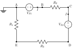 - Compute the relative potentials of points A, B, C, D and E which point A is grounded. Calculate the voltage drop across resistance R1? Does it affect the circuit operation or potential difference between any pair of points ?[where, R1=6Ω,R2=2 Ω,R3=4Ω,VS1=34 V,VS2=10 V,I=2 A]. [Ans:V=12 V]