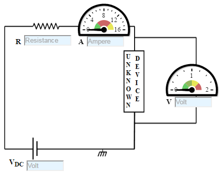 - Take the readings and note Voltmeter reading across the unknown device and Ammeter reading.