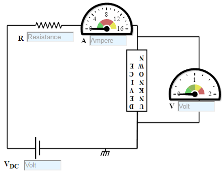 - Take the readings and note Voltmeter reading across unknown device and Ammeter reading.