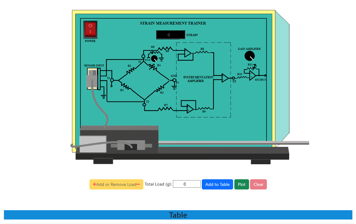 Upon clicking the 'Table' button situated at the bottom of the page, the observation table will show up. To observe the strain in the absence of any load, one must select the 'Add to Table' option. A non-zero value will be displayed as a result of the strain gauge's sensitivity.