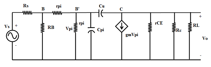 The high frequency equivalent circuit of the common-emitter amplifier is shown in Figure 3.
