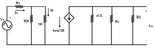 $$A_m=\frac{V_o}{V_s} =-β [r_{CE}|| R_C || R_L][\frac{R_B}{R_B+r_{pi}}][\frac{1}{R_S+(R_B||r_{pi})}]$$