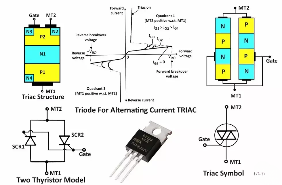 The triac is equivalent to two SCRs connected back to back. Therefore it is a bidirectional device that can conduct positive as well as negative half cycles of the supply voltage. As shown in Figure 2.The gate current can be positive or negative.