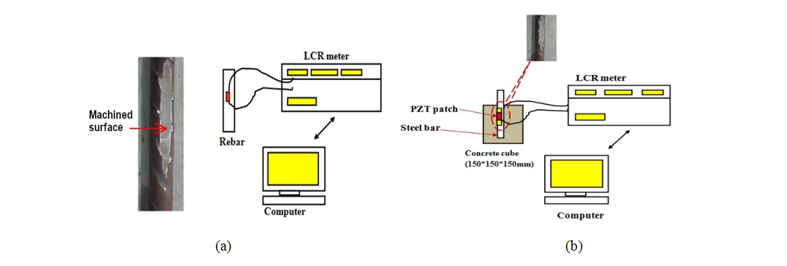 PZT patches bonded to rebar which is further connected to LCR meter by electrodes.