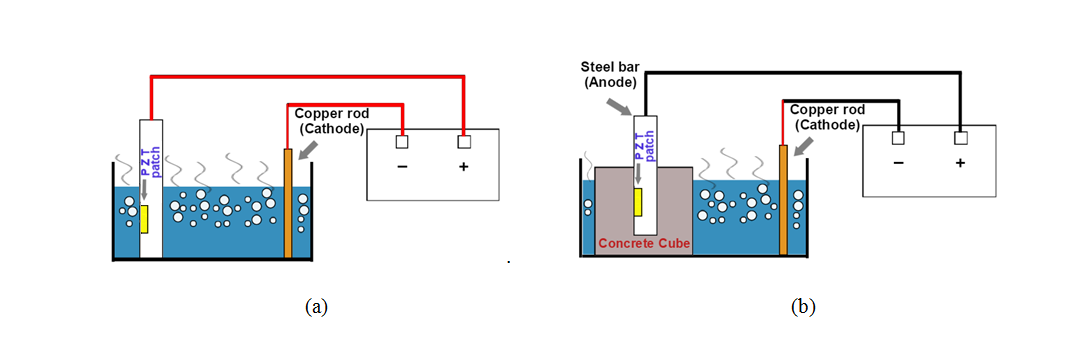 Figure 1: Data acquisition setup for accelerated corrosion in (a) bare rebar (b) embedded rebar