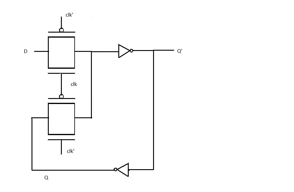 Applying analogy, we realize that when clock=1 the input to the CMOS pass transistor should be D and when clock=0 the input to the pass transistor should be value of D just before the transition of clock from 1 to 0. To obtain the value of D just before transition a buffer is needed. The final design is given below: