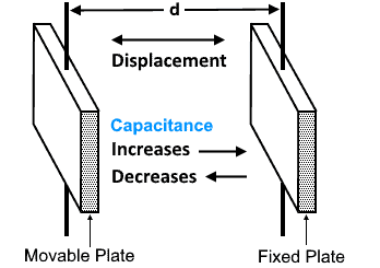 The capacitance of the transducer is inversely proportional to the distance between the plates. The one plate of the transducer is fixed, and the other is movable. The displacement that is to be measured links to the movable plates.