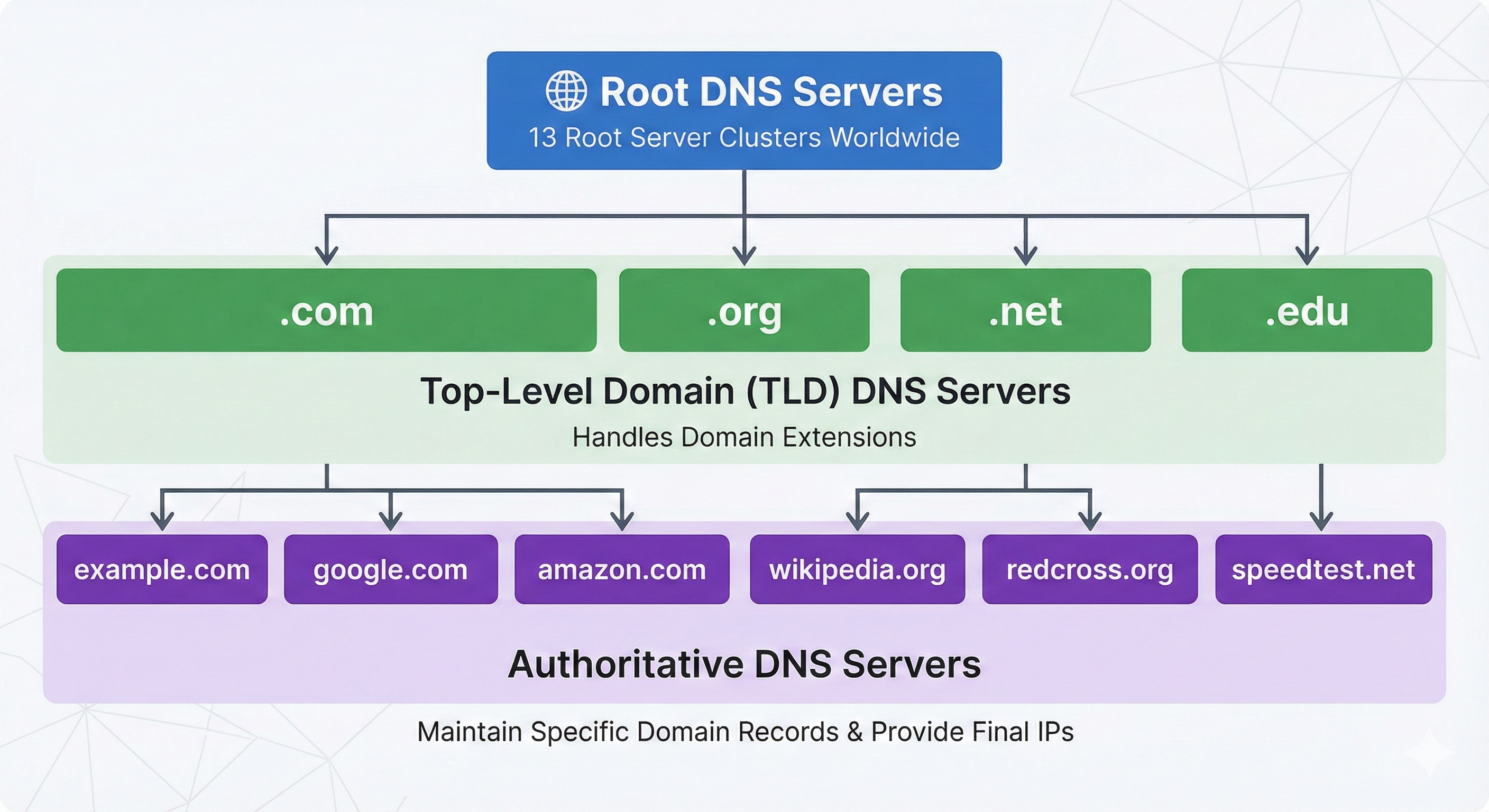Top-Level Domain (TLD) DNS Servers: Sitting just below the root are the TLD servers. These servers are responsible for managing specific domain extensions, such as