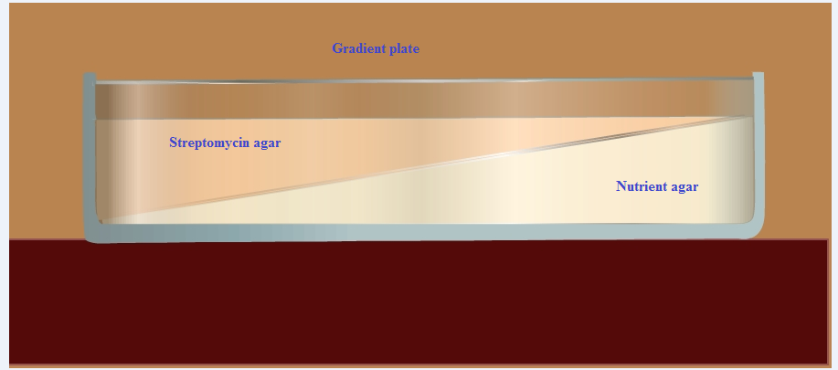 An excellent way to determine the ability of organisms to produce mutants that are resistant to antibiotic is to grow them on a gradient plate of a particular antibiotic. The gradient plate consists of two wedges like layers of media: a bottom layer of plain nutrient agar and top layer of antibiotic with nutrient agar. The antibiotic in the top layer, diffuse into the bottom layer producing a gradient of antibiotic concentration from low to high. A gradient plate is made by using Streptomycin in the medium. E. coli, which is normally sensitive to Streptomycin, will be spread over the surface of the plate and incubated for 24 to 72 hours. After incubation colonies will appear on both the gradients. The colonies develop in the high concentration are resistant to the action of Streptomycin, and are considered as Streptomycin resistant mutants. For isolation of antibiotic resistant of gram negative enteric bacteria, the antibiotics commonly used are Rifampicin, Streptomycin, and Erythromycin etc.