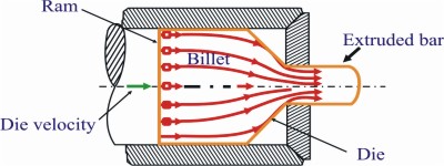Hot extrusion is a metal forming process of forcing a heated billet to be reduced in its cross section by forcing it to flow through a shaped die opening under a high pressure. During extrusion metal billet is under compression stress state in all three directions and shear forces. No tensile force is produced, which makes high deformation possible without tearing the metal.