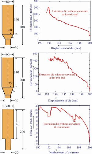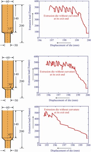 Figure 5: Dies with different inclination angle with their corresponding extrusion load curve.