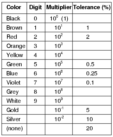 | Black | 0 | $$ 10^0 \quad Ω $$ | ||