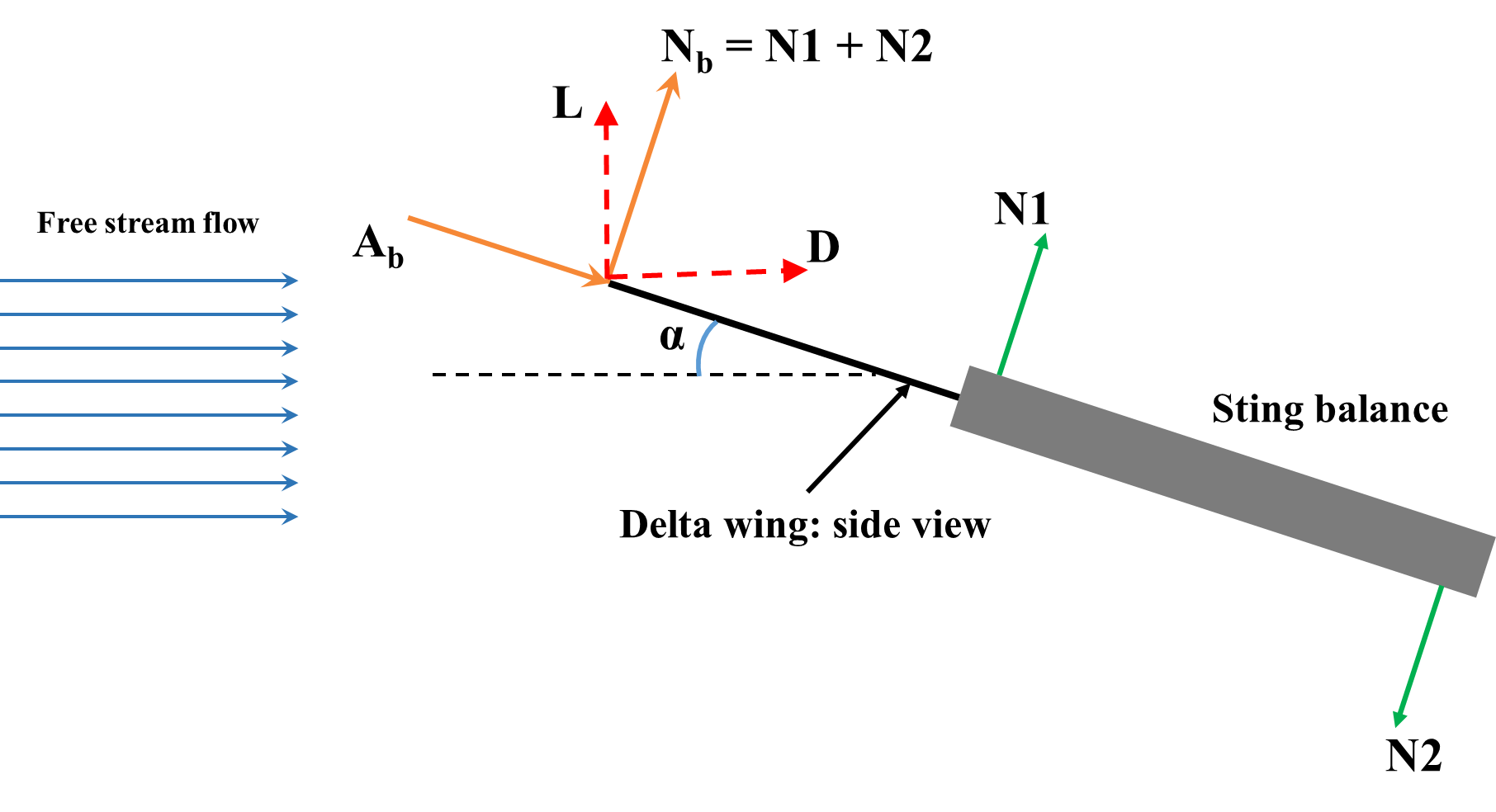 Figure: N1 and N2 from sting balance constitute Nb for the delta wing, which along with Ab and α can be used to get L and D.