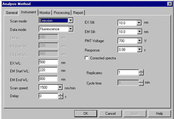 To run the wavelength scan for the emission spectrum, click on 'OK' button on the set-up screen. One has to be sure that the solvent blank does not fluoresce in the wavelength range of interest.