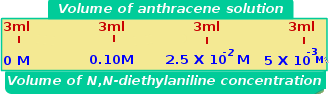 Prepare a 3 x 10-4 M solution of anthracene in the presence of following concentrations of N,N-diethylaniline in spectroscopic grade toluene. (i) 0 M; (ii) 5 x 10-3 M; (iii) 2.5 x 10-2 M and (iv) 0.10 M. Here the solutions are shown on the concentration selection bar.