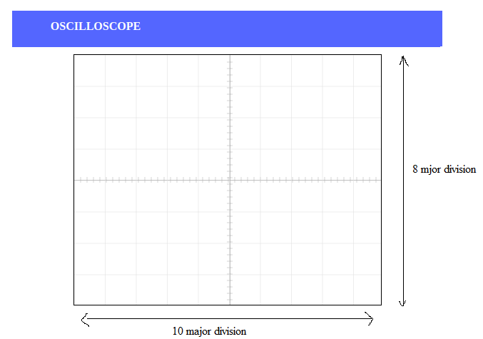 The screen is cathode ray tube found in most television sets where the face of the screen is divided up into a 2 dimensional grid (or axes or scale); In this experiment we consider 8x10 grid. The vertical grid is divided up into 8 (major) divisions and the horizontal grid is divided into 10 major divisions. To improve the precision, each of these divisions is further broken up into 5 minor divisions. The horizontal axis (X-axis) represents time and the vertical axis (Y-axis) represents voltage. The scope displays (also called a signal trace or trace) the input signal voltage along the vertical (or Y-axis) while an internally generated signal (called the horizontal sweep or sweep signal) is simultaneously produced along the X-axis creating a 2- dimensional time trace of the input signal.