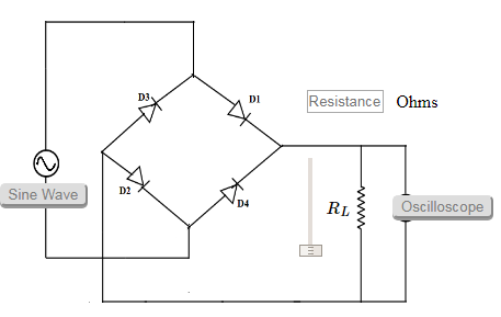 - Channel 1 shows the input sine waveform, Channel 2 shows the output rectified waveform.