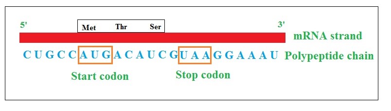 The ribosome initiate translation, when it finds the start codon, sequence AUG in the mRNA. AUG codon is a part of slightly larger sequence, Kozak consensus sequence, GCCACCAUGG AUG codes for methionine, hence protein translation initiates with amino acid methionine. The triplet codon sequence determines which amino acid is getting added to the growing protein chain. During the initiation process, small 40s subunit of the ribosome binds to the 5’ cap of mRNA and the larger 60s subunit binds subsequently to complete the initiation complex. Ribosome possesses two tRNA binding sites, P site holding the peptide chain and the A site for accepting the tRNA. During elongation phase, Methionine-tRNA binds to the P site, aminoacyl-tRNA complementary next codon binds to the A site using the energy yielded from GTP hydrolysis. Methionine from P site moves to the A site for binding to new amino acid there, and elongates the peptide chain. tRNA molecules leave the ribosome and the cycle continues for synthesizing peptide chain. The growth of polypeptide is from the N terminal (methionine) to the C terminal (the final amino acid coded). A stop codon is a trinucleotide sequence in mRNA molecule that signals to terminate protein synthesis. When the ribosome encounters a stop codon, or nonsense codon, it falls off from the mRNA, and the polypeptide chain growth is completed. The common variations of stop codons are UGA, UAA, and UAG (Fig.1). The segment of mRNA precedingthe starting point is not translated and is denoted as the 5′ untranslated region (5′ UTR) and mRNA succeeding the stop codon will also not be translated and is known as the 3′ UTR. The polypeptide sequence beginning from start codon to the stop codon is known as an open reading frame.