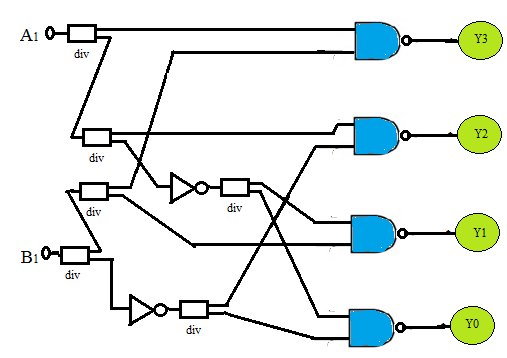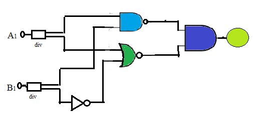 b. Write down the equation for the output. Note: The div block (Y connector) represented in the above diagram is to indicate that a particular input say A1 is connected as input to both the gates (NAND & NOR). The output of AND gate is given to a Green LED.