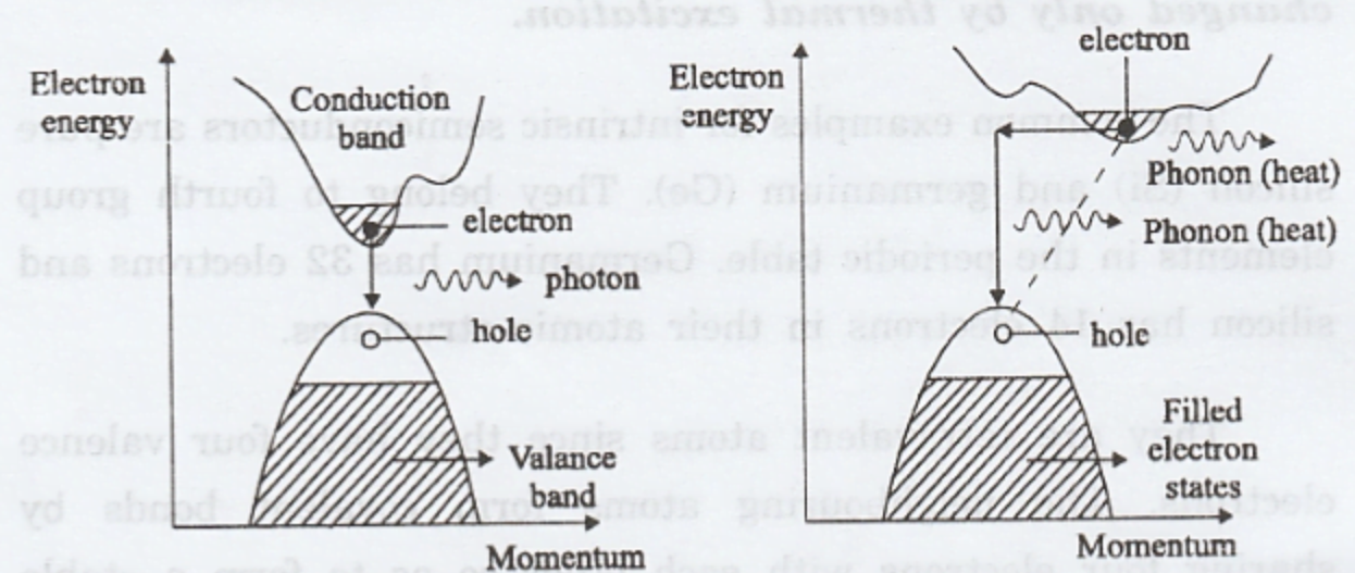 Diagrams showing direct band transitions (left) with only photon emission, and indirect band transitions (right) requiring phonon assistance for momentum conservation. (If this image is from an external source, please add appropriate reference.)