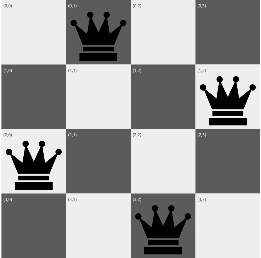 Below is the initial state of the 4-queens problem, where each queen is placed in a different column. The heuristic cost function h = 4, as there are 4 pairs of queens that are attacking each other.