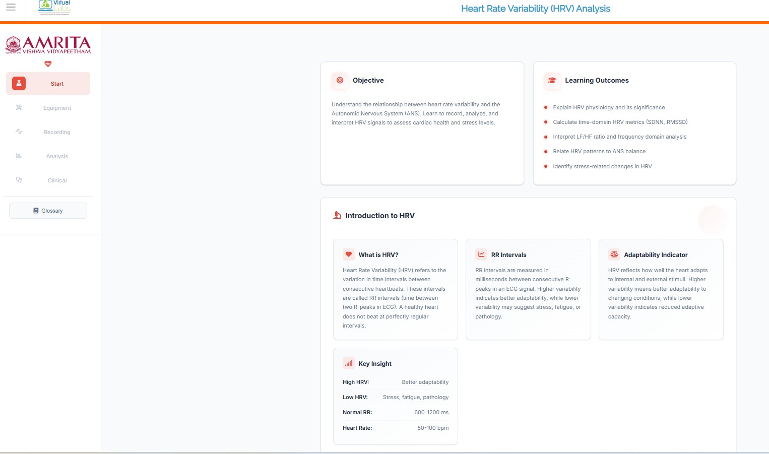 - The result interpretation of the HRV analysis is displayed and the users can map this interpretation guide while experimenting on a real-time basis. The analysis summary presents detailed information about the ECG signal recorded during the simulation.