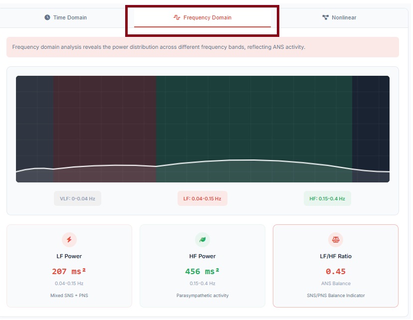 - The frequency domain typically performed using spectral analysis methods such as Fast Fourier Transform (FFT) or autoregressive modelling. It represents how the variance in RR intervals is distributed across different frequency bands, providing insights into autonomic nervous system (ANS) regulation. The LF/HF ratio indicates the of autonomic balance.