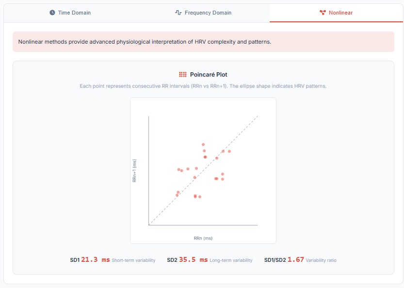- The nonlinear analysis examines the complex, irregular, and chaotic behavior of heart rhythms that cannot be fully captured time and frequency domain analysis. The Poincaré Plot is a scatter plot of each RR interval against the next and it provides a visual representation of beat-to-beat variability.