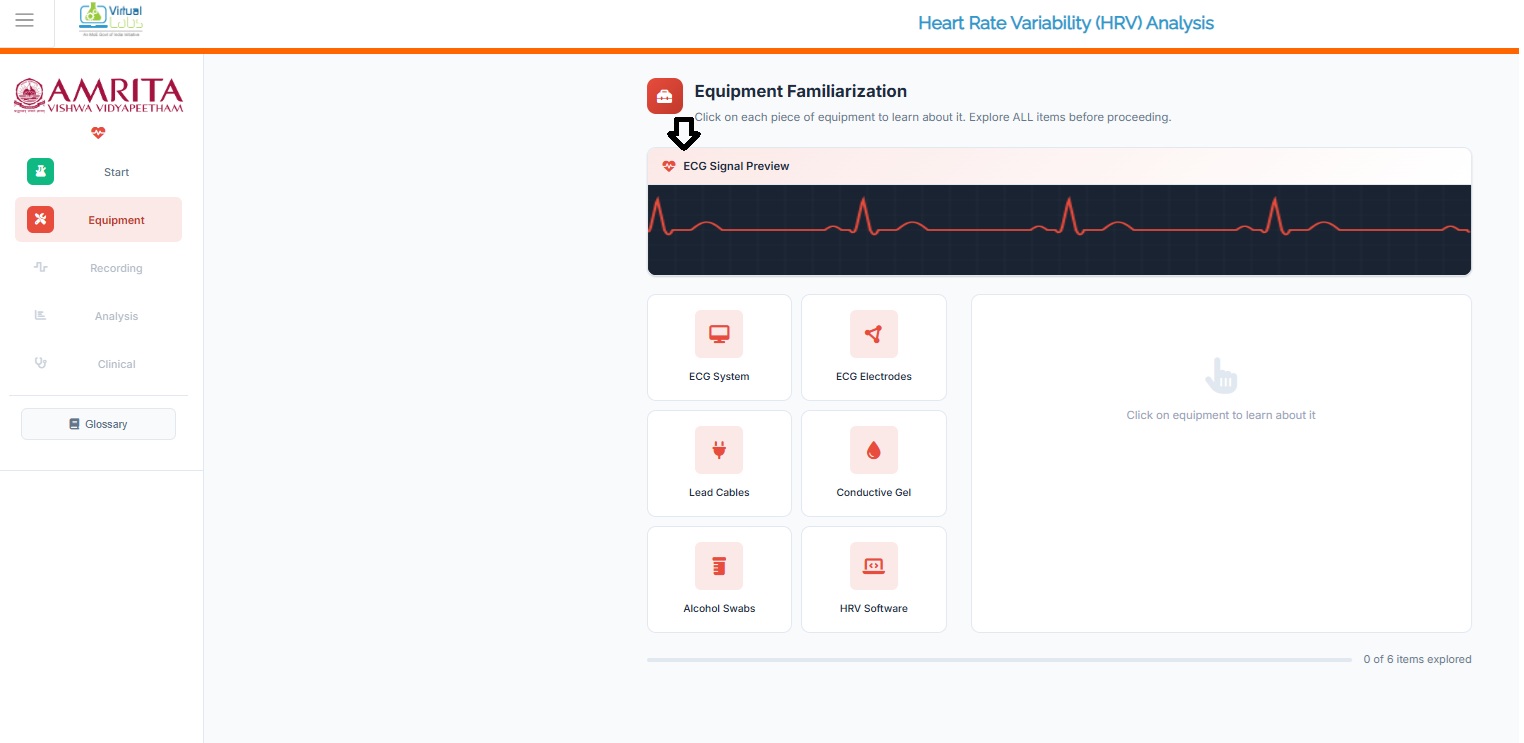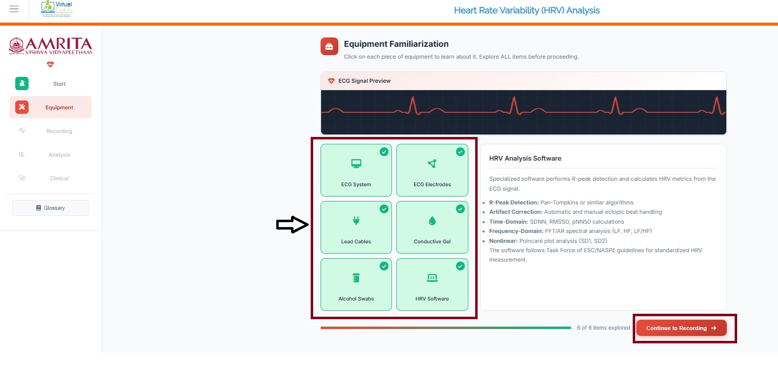 - When completing the six components provided in the simulator window, click on the Continue to recording button to study HRV and its recording processes.