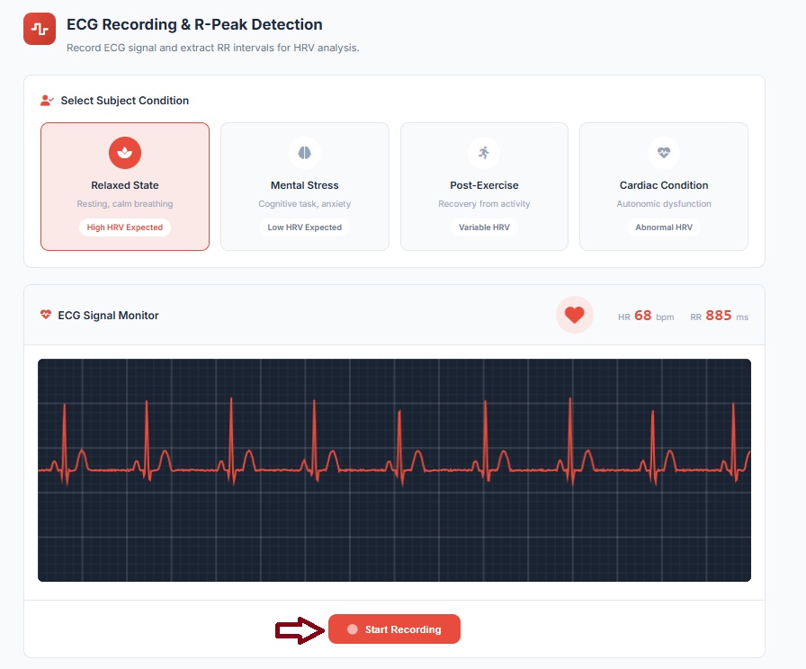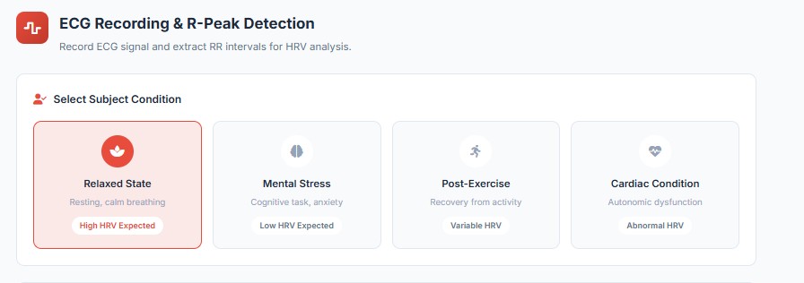 - The user can observe different subject conditions such as Relaxed state, Mental stress, post-exercise, and cardiac condition. Click on any of the subject conditions to proceed with the experiment.
