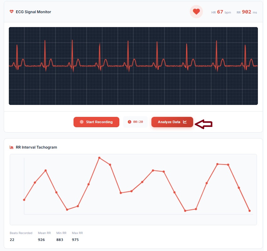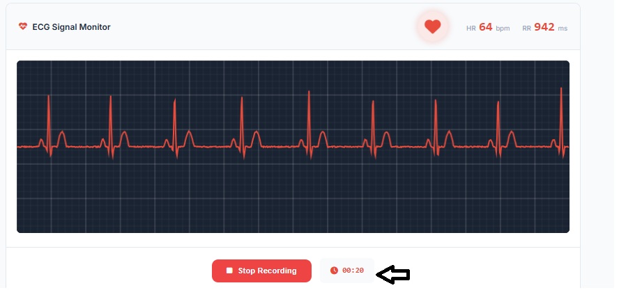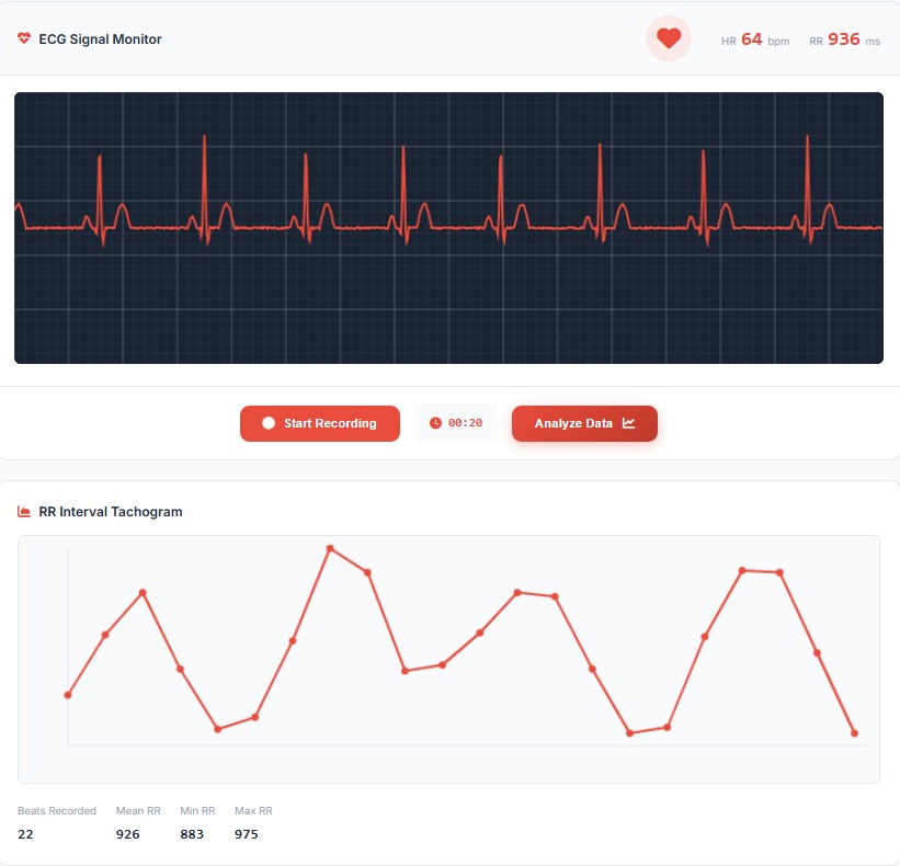 - Next, click on the stop recording button. A 20-second ECG signal is captured for analysis. Users can then observe the corresponding RR interval tachogram plot derived from the recorded signal.