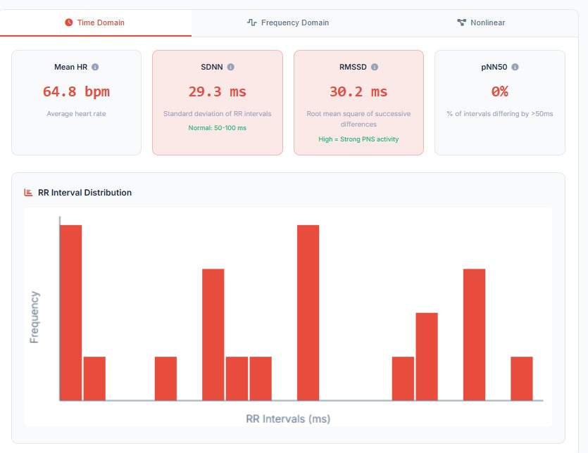 - The time domain, frequency domain and nonlinear analysis were displayed in the simulator window. Users can choose the respective domains to observe the results. In the time-domain analysis, distribution of RR intervals is statistically represented through a histogram. It provides insight into beat-to-beat variability and autonomic regulation of the heart.