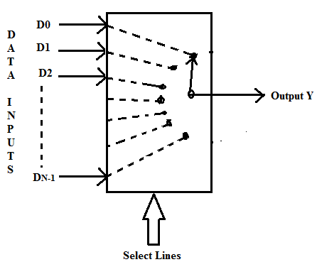 Multiplexer or Data Selector is a very widely used combinational circuit. It has multiple inputs and one output. It accepts several data inputs and allows only one of them at a time to get through to the output. The routing of the desired input to the output is controlled by the select lines. M select lines can select one of the 2M input channels. The generalized block schematic of a multiplexer is shown in Fig. 2. Mechanical rotary switch is a good analogy to explain the MUX concept.