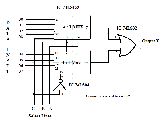 Fig. 3. Eight to One Multiplexer using IC 74LS153